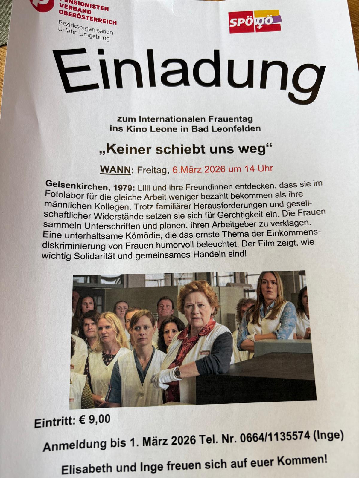 Einladung zum Internationalen Frauentag ins Kino Bad Leonfelden Freitag, 6. März 2026 um 14 Uhr Anmeldung bis 1. März bei Inge Hinterhölzl unter 0664 1135574