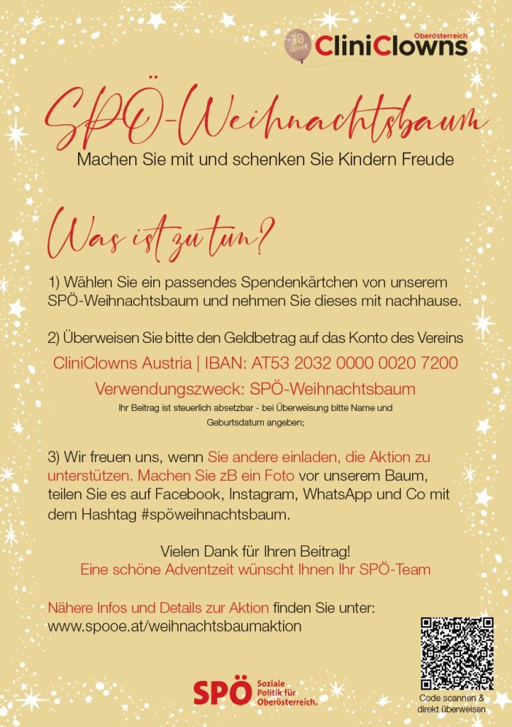 Auch heuer beteiligt sich die Ortsgruppe der SPÖ Oberneukirchen an der weihnachtlichen Spendenaktion , die jährlich von der SPÖ organisiert wird. Wie schon in den vergangenen Jahren haben wir dazu in den Orten Oberneukirchen, Waxenberg und Traberg Christbäume geschmückt und aufgestellt. Auf den Christbäumen hängen Kärtchen auf denen beschrieben ist für welchen Zweck gespendet wird und wie man mitmachen kann. Wenn Sie spenden möchten, finden Sie Details dazu auch auf dem zweiten Bild in diesem Text.